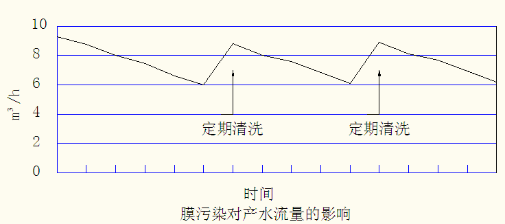 如下圖所示 說明了膜元件在實際運行中產水流量會隨著時間的增加而降低,定期的清洗可以大程度的恢復系統(tǒng)的性能。在大多數情況下,污垢的去除將會緩解系統(tǒng)性能下降的趨勢,正如圖中“鋸齒”模式所闡述的。